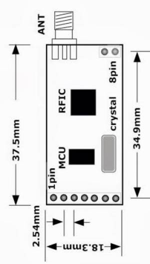 Portée maximale : 1000m (en extérieur) à 2400 bps Puissance d'émission : de 1 à 20 mW (réglable, puissance à utiliser en Europe : 10 mW) Vitesse de transmission RF : de 2400 à 9600 bps Vitesse UART : 1200 à 57600 bps Tampon (Buffer) de 256 octets Haute sensibilité (-112dbbm à 9600 bps) Modulation GFSK Interface UART / TTL Fréquence : de 418 Mhz à 455 Mhz (réglable, fréquence à utiliser en Europe : 433 Mhz) Plus de 100 canaux (intervale de 200 Khz) Alimentation : 3,5V à 5,5V, 42 mA (maxi) Courant en réception : 28 mA, en veille : 5 uA Logiciel de configuration Le module interface série USB / TTL à base de CP2102 est compatible Windows, Mac et Linux. Dimensions d'un module : 38 x 19 x 7 mm Dimensions d'une antenne : longueur : 58 mm, diamètre 7,7 mm Poids d'un module avec son antenne : 10 grammes