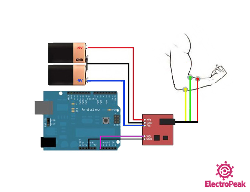 Le circuit suivant montre comment vous devez connecter Arduino au capteur EMG. Connectez les fils en conséquence.