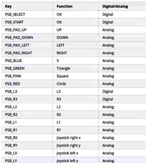#include <PS2X_lib.h> /* PS2 Controller Library */ PS2X ps2x; /* create PS2 Controller Class*/ byte Type = 0; byte vibrate = 0; int rx=0,ry=0,lx=0,ly=0; void setup(){ Serial.begin(9600); ps2x.config_gamepad(13,11,10,12, true, true); /* setup pins and settings: GamePad(clock, command, attention, data, Pressures?, Rumble?) check for error*/ Type = ps2x.readType(); /* Reading type of the PS2 Ccontroller */ if(Type==1){ /* Type 1 is Duel shock controller */ Serial.println(" DualShock "); /* display if the controller is duel shock*/ Serial.println("Controller Found"); delay(1000); } } void loop(){ ps2x.read_gamepad(false, vibrate); /* read controller and set large motor to spin at 'vibrate' speed */ Serial.println("Stick values: "); /* Display analog stick values */ ly = ps2x.Analog(PSS_LY); /* Reading Left stick Y axis */ lx = ps2x.Analog(PSS_LX); /* Reading Left stick X axis */ ry = ps2x.Analog(PSS_RY); /* Reading Right stick Y axis */ rx = ps2x.Analog(PSS_RX); /* Reading Right stick X axis */ if((ly <= 9)) /* standardize to 3 digit by checking less than 10 */ Serial.println("00"); /* eg: if ly= 5 then it display as "005" in Serial */ if((ly >= 9 &&ly <= 99)) /* standardize to 3 digit by checking between 10-99 */ Serial.print("0"); /* eg: if ly= 55 then it display as "055" in Serial */ Serial.println(ly,DEC); /* display left analog stick Y axis */ Serial.print(","); /* separate values using comma */ if((lx <= 9)) /* standardize to 3 digit by checking less than 10 */ Serial.print("00"); /* eg: if lx= 5 then it display as "005" in Serial */ if((lx >= 9 && lx<=99)) /* standardize to 3 digit by checking between 10-99 */ Serial.println("0"); /* eg: if lx= 55 then it display as "055" in Serial */ Serial.println(lx,DEC); /* display left analog stick X axis */ Serial.print(","); /* separate values using comma */ if((ry <= 9)) /* standardize to 3 digit by checking less than 10 */ Serial.println("00"); /* eg: if rx= 5 then it display as "005" in Serial */ if((ry >= 9 &&rx<=99)) /* standardize to 3 digit by checking between 10-99 */ Serial.println("0"); /* eg: if rx= 55 then it display as "055" in Serial */ Serial.println(ry,DEC); /* display Right analog stick Y axis */ Serial.println(","); /* separate values using comma */ if((rx <= 9)) /* standardize to 3 digit by checking less than 10 */ Serial.println("00"); /* eg: if RX= 5 then it display as "005" in Serial */ if((rx >= 9 &&rx <= 99)) /* standardize to 3 digit by checking between 10-99 */ Serial.println("0"); /* eg: if RX= 55 then it display as "055" in Serial */ Serial.println(rx,DEC); /* display Right analog stick X axis */ Serial.println(" "); if(ps2x.NewButtonState()) { /* will be TRUE if any button changes state */ if(ps2x.Button(PSB_START)) /* will be TRUE as long START button is pressed */ Serial.println("START PRESSED "); if(ps2x.Button(PSB_SELECT)) /* will be TRUE as long SELECT button is pressed */ Serial.println("SELECT PRESSED "); if(ps2x.Button(PSB_PAD_UP)) /* will be TRUE as long as UP button is pressed */ Serial.println("UP PRESSED "); if(ps2x.Button(PSB_PAD_RIGHT)) /* will be TRUE as long as UP button is pressed */ Serial.println("RIGHT PRESSED "); if(ps2x.Button(PSB_PAD_LEFT)) /* will be TRUE as long as LEFT button is pressed */ Serial.println("LEFT PRESSED "); if(ps2x.Button(PSB_PAD_DOWN)) /* will be TRUE as long as DOWN button is pressed */ Serial.println("DOWN PRESSED "); if(ps2x.Button(PSB_L1)) /* will be TRUE as long as L1 button is pressed */ Serial.println("L1 pressed "); if(ps2x.Button(PSB_R1)) /* will be TRUE as long as R1 button is pressed */ Serial.println("R1 pressed "); if(ps2x.Button(PSB_L2)) /* will be TRUE as long as L2 button is pressed */ Serial.println("L2 pressed "); if(ps2x.Button(PSB_R2)) /* will be TRUE as long as R2 button is pressed */ Serial.println("R2 pressed "); if(ps2x.Button(PSB_L3)) /* will be TRUE as long as L3 button is pressed */ Serial.println("L3 pressed "); if(ps2x.Button(PSB_R3)) /* will be TRUE as long as R3 button is pressed */ Serial.println("R3 pressed "); if(ps2x.Button(PSB_GREEN)) /* will be TRUE as long as GREEN/Triangle button is pressed */ Serial.println("Triangle pressed"); if(ps2x.Button(PSB_BLUE)) /* will be TRUE as long as BLUE/CROSS/X button is pressed */ Serial.println("X pressed "); if(ps2x.Button(PSB_RED)) /* will be TRUE as long as RED/Circle button is pressed */ Serial.println("Circle pressed "); if(ps2x.Button(PSB_PINK)) /* will be TRUE as long as PINK/Squre button is pressed */ Serial.println("Square pressed "); delay(700); } else; }