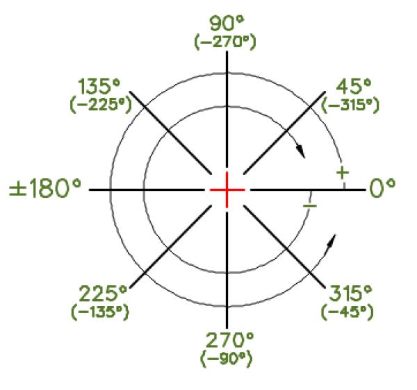 Les coordonnées polaires utilisent une distance et un angle pour placer un point dans le plan. On utilisera cette fois le symbole < pour séparer distance puis angle: “100<45”