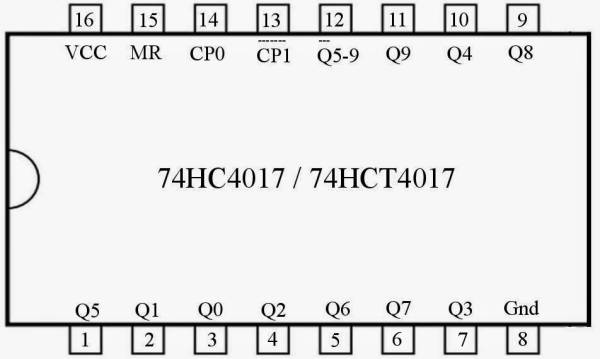 Broche 15 ⇒ qui reset le 74HC4017; on peut la relier au (-); un (+) fait un reset