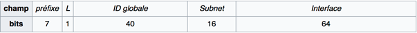 Ce type d’adresses regroupe les adresses loopback, dont la portée est limitée à l’hôte, les adresses locales de lien et les adresses locales uniques (aussi appelées ULA). Ces dernières, ont une portée globale et possède le découpage suivant :
