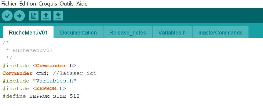 Pour faciliter la composition des menus en mode texte pour avoir un paramétrage simple et efficace, j'ai choisi “Commander”. Lien vers le Wiki Commander Au niveau du code, on a le code principale de notre projet dans lequel on configure Commander sur une liaison série ou bluetooth série. Les menus et les commandes se font dans l'onglet Commander. Il faudra donc adapter cet onglet pour notre besoin