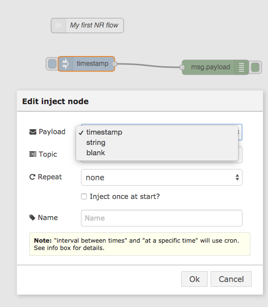 Augmentons-le maintenant un peu pour voir ce que nous pouvons faire d'autre avec ce flux simple. Tout d'abord, nous allons modifier le nœud d'injection pour envoyer un message texte plutôt qu'un horodatage. Pour ce faire, sélectionnez le nœud d'injection dans le flux et double-cliquez dessus. Vous verrez une fenêtre de configuration comme celle de la figure 2.8.
