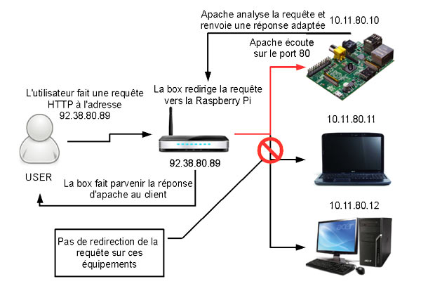 Hors, si vous avez mis en place un serveur web, c’est, à priori, que vous souhaitez partager des ressources, créer un site perso, rendre vos fichiers accessibles depuis n’importe où, etc. Bref, que vous voulez diffuser des données à travers les réseaux du monde entier, et en premier lieu internet, ce qui implique que votre serveur soit accessible depuis n’importe quel réseau, depuis n’importe quelle machine, et non pas uniquement depuis les ordinateurs branchés sur le même réseau que votre Raspberry.