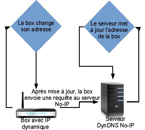 À chaque redémarrage de votre box, ou à chaque fois qu’elle changera d’adresse, elle enverra une requête à No-IP. Grâce à cette requête, No-IP va mettre à jour l’adresse IP correspondant à votre box dans sa base de données.