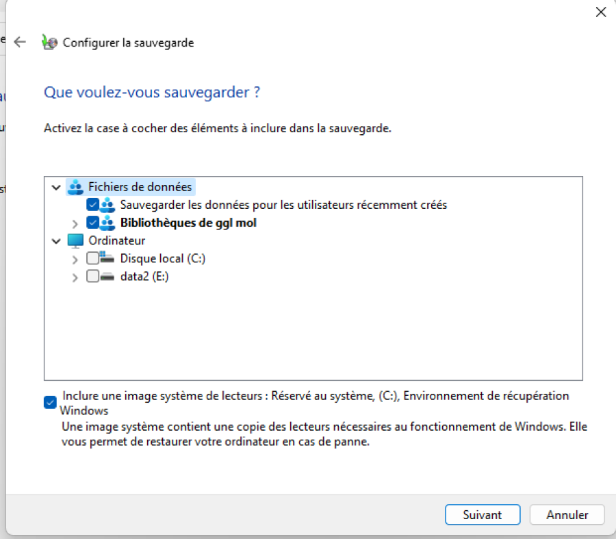 - -5- Sélectionnez Laisser Windows choisir (recommandé) ou Me laisser choisir pour choisir les fichiers utilisateur, les disques et l'image système à sauvegarder. Cliquer sur Suivant pour continuer.