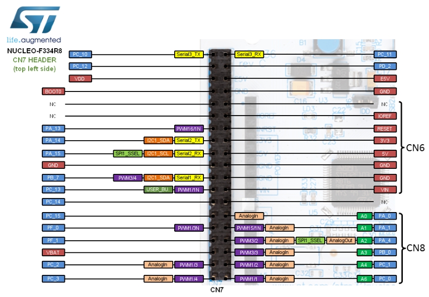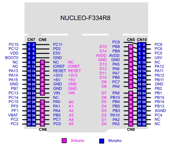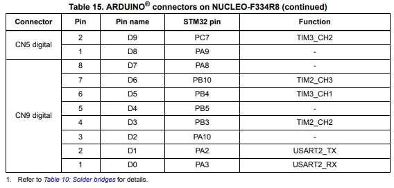 Pour piloter la led intégrée qui est connue comme “D13” sur Arduino, il faut sur la carte STM32334R8, piloter la sortie “PA5”, ou “PA_5” comme illustré dans le tableau de correspondance ci-dessous :