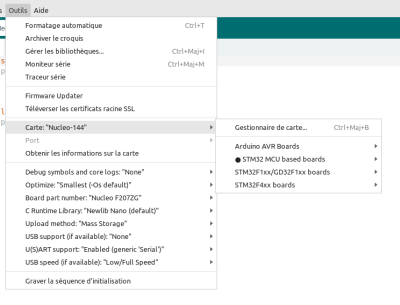 -3- Dans “Outils” –> “Carte” choisir “STM32 MCU Based Board” et “Nucleo 144”