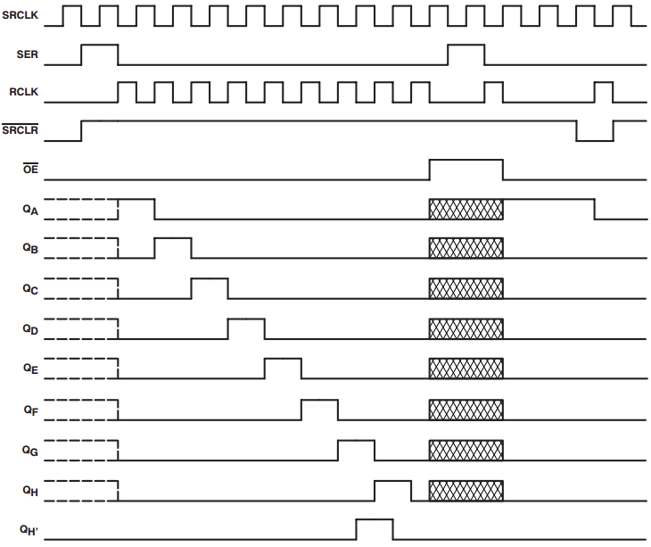 SH_CP ou RCLK shift register clock input. Le signal d’horloge du registre qui détermine si on écrit dans la mémoire