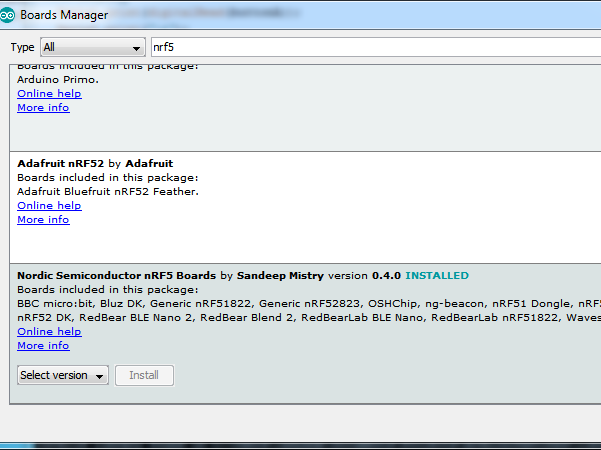 Ouvrez Outils > Carte > Gestionnaire de cartes dans la barre de menu, recherchez nRF5 et installez « Nordic Semiconductor nRF5 Boards » par Sandeep Mistry
