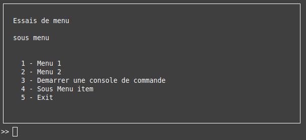 menu = ConsoleMenu("Essais de menu", "sous menu")
