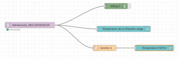 On utilise le même noeud MQTT IN pour recevoir les infos de temperature que la page precedente. (Topic = tele/tasmota_6B2128/SENSOR)