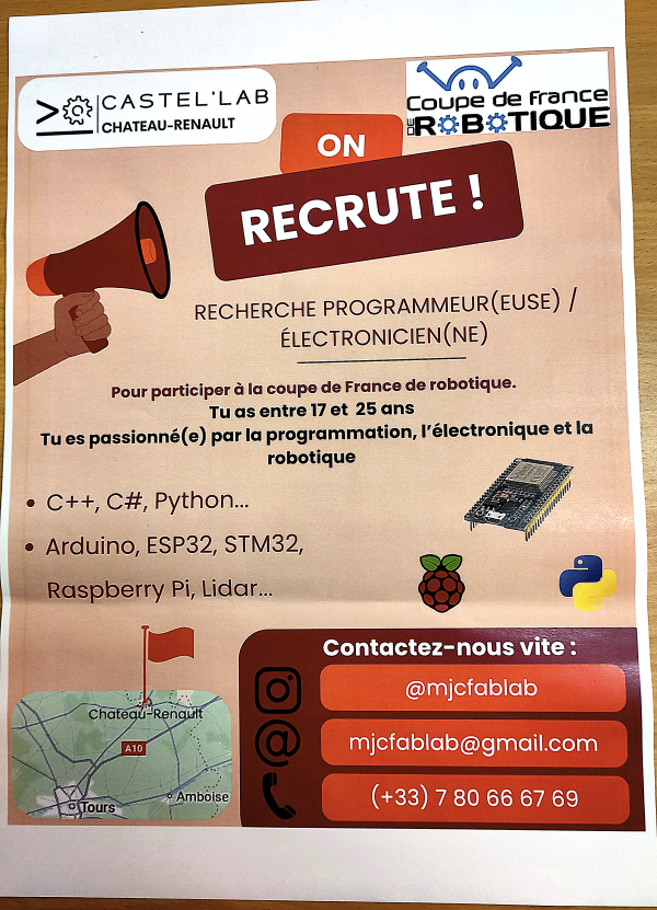 • Coupe de France robotique : le samedi de 14h à 18h ( sauf vacances scolaires )