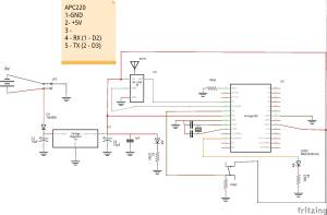 Schéma de l'émetteur coté BAL utilisant un ATméga328, avec son Quartz 16 Mhz, son régulateur 7805 5V, un interrupteur de détection de courrier, une LED de vérification, un APC220 pour la liaison série.