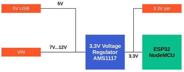 La première possibilité et aussi la plus simple pour une alimentation électrique est le câble USB 5V. Mais comme l'ESP32 fonctionne à 3,3 V, il existe un régulateur de tension intégré pour transformer le 5 V de la connexion USB au 3,3 V souhaité. La broche 3,3 V du PCB NodeMCU est également alimentée par cette connexion.
