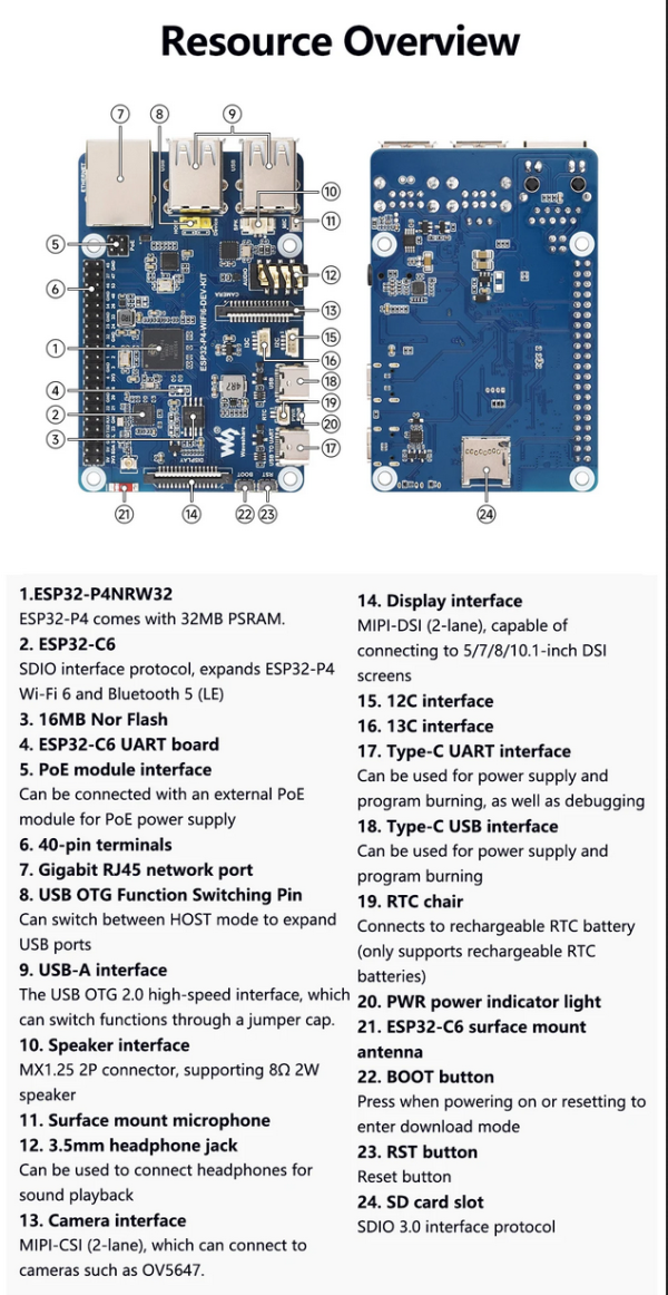- Les périphériques incluent 55 GPIO programmables, MIPI-CSI, MIPI-DSI, USB 2.0 OTG, Ethernet, SDIO 3.0, I3C, SPI, I2S, I2C, LED PWM, MCPWM, RMT, ADC, UART et TWAI™