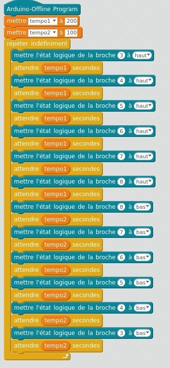 // ce programme allulme les leds une par une int pin[6]={3,4,5,6,7,8}; int temp0=200; //tempo pour allumer les leds int temp1=100; // tempo pour eteindre void setup(){ for (int i = 0 ; i<=5 ; i++){ pinMode(pin[i], OUTPUT); } } void loop(){ for (int i = 0 ; i<=5 ; i++){ // boucle for pour allumer les leds une par une digitalWrite(pin[i], HIGH); delay(temp0); } for (int i = 5 ; i>=0 ; i--){ digitalWrite(pin[i], LOW); delay(temp1); } }