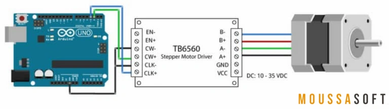 - CLK- et CLK+ : Connectez CLK- à la masse (GND) d’Arduino et CLK+ à une broche d’Arduino (par exemple, broche 3) pour générer les impulsions de pas.