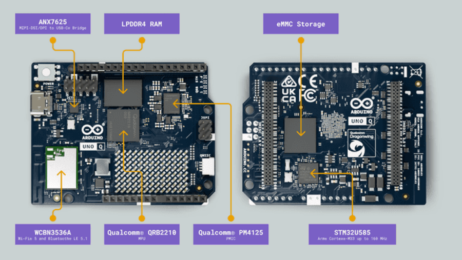 L'Arduino UNO Q ouvre un nouveau niveau de performance pour l'écosystème Arduino, combinant la puissance de calcul robuste du microprocesseur avancé Dragonwing™ QRB2210 de Qualcomm exécutant un système d'exploitation Linux Debian complet avec prise en charge amont, et la réactivité en temps réel d'un microcontrôleur STM32U585 dédié exécutant des programmes Arduino sur Zephyr OS - le tout sur un ordinateur monocarte.
