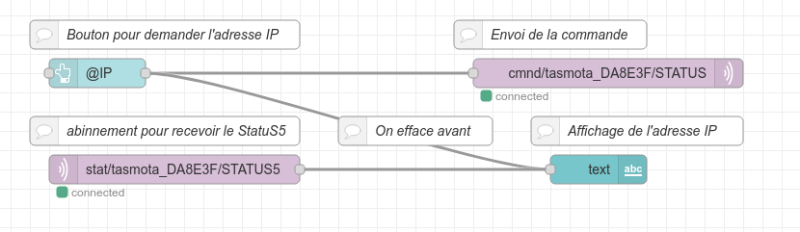 Le noeud “MQTT-In” recupere du serveur MQTT via la commande “stat/tasmota_4ECECC/STATUS5” l'@IP de notre tasmota que l'on affiche via le noeud “Texte” de notre Dashboard via 'Value Format“ {{msg.payload.StatusNET.IPAddress}}