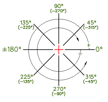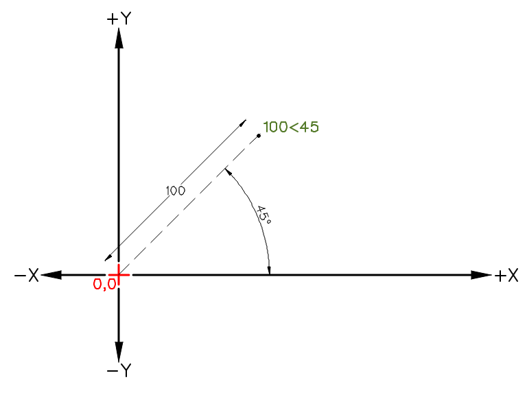 Les coordonnées polaires utilisent une distance et un angle pour placer un point dans le plan. On utilisera cette fois le symbole < pour séparer distance puis angle: “100<45”