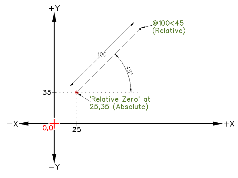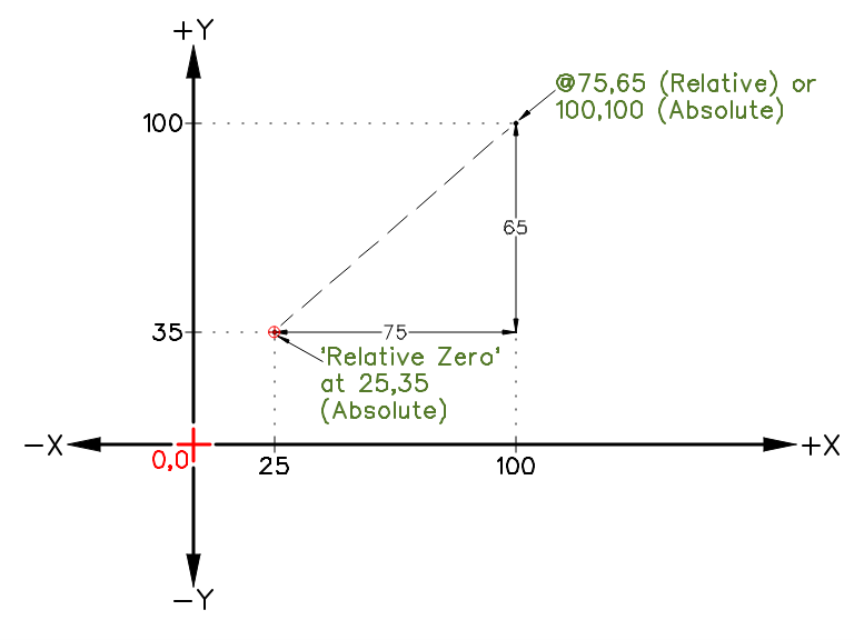 Comme dit plus haut, il est possible de travailler selon une origine absolue (un point de coordonnées 0,0 qui ne changera jamais), notion assez traditionnelle dans les logiciels de dessin cités plus avant. Néanmoins, Librecad permet de travailler avec un zéro relatif. La mire rouge visible sur le plan de travail qui le matérialise se place automatiquement au dernier point dessiné sur le plan de travail. Il est également possible de le déplacer manuellement (“Set relative zéro position” ou rz en ligne de commande). En ligne de commande, pour se référer au zéro relatif, il faut faire précéder les coordonnées d'une arobase.