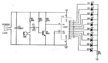 Broche 14 ⇒ entree horloge , dans notre exemple nous avons une tension de 3v toutes les 50 ms qui fait avancer le compteur, qui met les 10 sorties au (+) successivement de Q0 à Q9 suivant la fréquence de l'entree horloge.