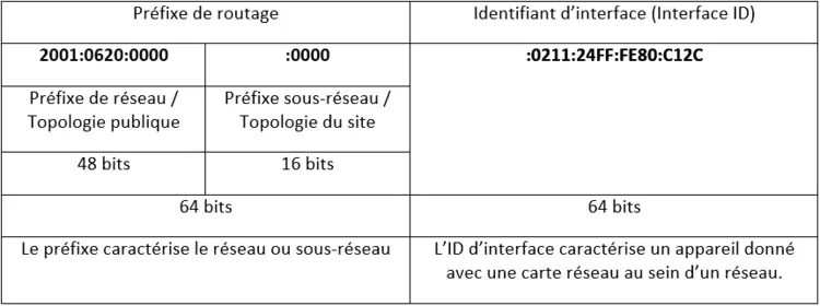 - Adresse IPv6 : 2001:0620:0000:0000:0211:24FF:FE80:C12C