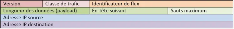 | Identificateur de flux (flow label) | Les paquets avec le même identificateur de flux sont traités de la même manière (20 bits) |