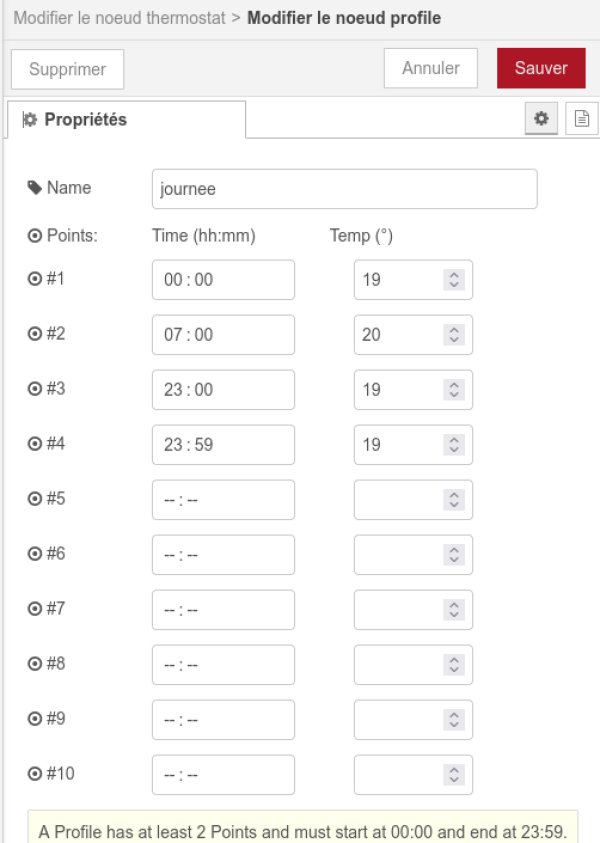 msg.topic: getProfile msg.payload: { "name": "profile-name", "points": [{ "00:00": 18 }, { "04:00": 18 }, { "08:00": 20.5 }, { "12:00": 20.5 }, { "12:00": 19 }, { "12:30": 19 }, { "13:30": 20.5 }, { "19:00": 20.5 }, { "19:00": 18 }, { "23:59": 18 }] }