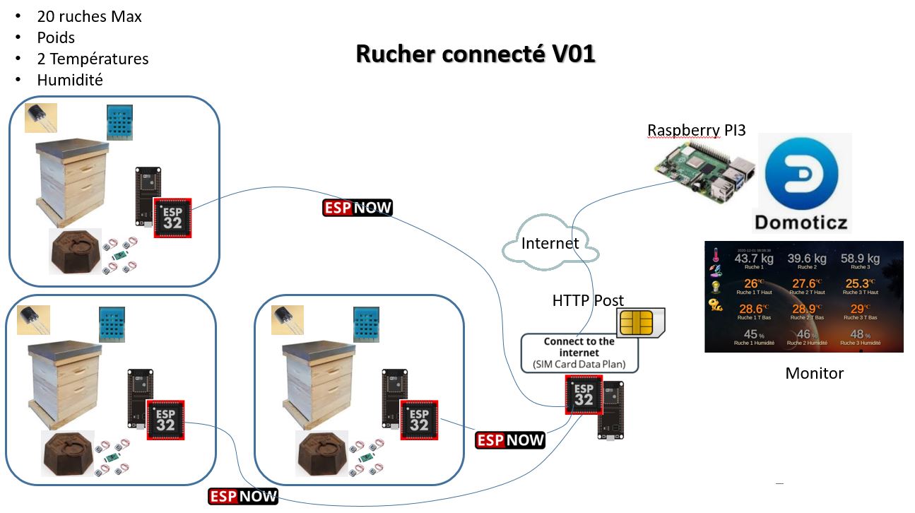 La conduite d'un rucher est une tâche difficile qui peut être facilité par la technologie. Ce projet “Le Rucher Connecté” permettra de recueillir des données essentielles de chaque ruche du rucher et de les amener jusqu'à l'apiculteur.
