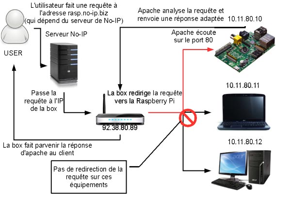 Hors, si vous avez mis en place un serveur web, c’est, à priori, que vous souhaitez partager des ressources, créer un site perso, rendre vos fichiers accessibles depuis n’importe où, etc. Bref, que vous voulez diffuser des données à travers les réseaux du monde entier, et en premier lieu internet, ce qui implique que votre serveur soit accessible depuis n’importe quel réseau, depuis n’importe quelle machine, et non pas uniquement depuis les ordinateurs branchés sur le même réseau que votre Raspberry.
