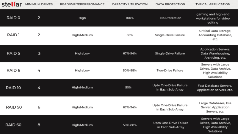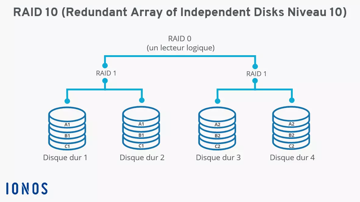 - RAID 10 :( 4 disques identiques minimum ) Il s'agit aussi d'une combinaison du RAID 0 et du RAID 1. Son avantage par rapport au RAID 5 est qu'il peut supporter une défaillance de 2 disques durs contre 1 seul disque dur défaillant pour le RAID 5.
