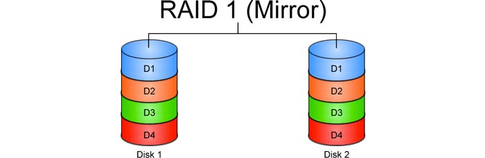 - RAID 1 : ( 2 disques identiques minimum ) Mode miroir. Améliore la sécurité de vos données en stockant les mêmes données sur les 2 disques durs sélectionnés lors de la création du RAID. Ainsi, si un disque dur meurt, vos données seront en sécurité sur l'autre disque dur.