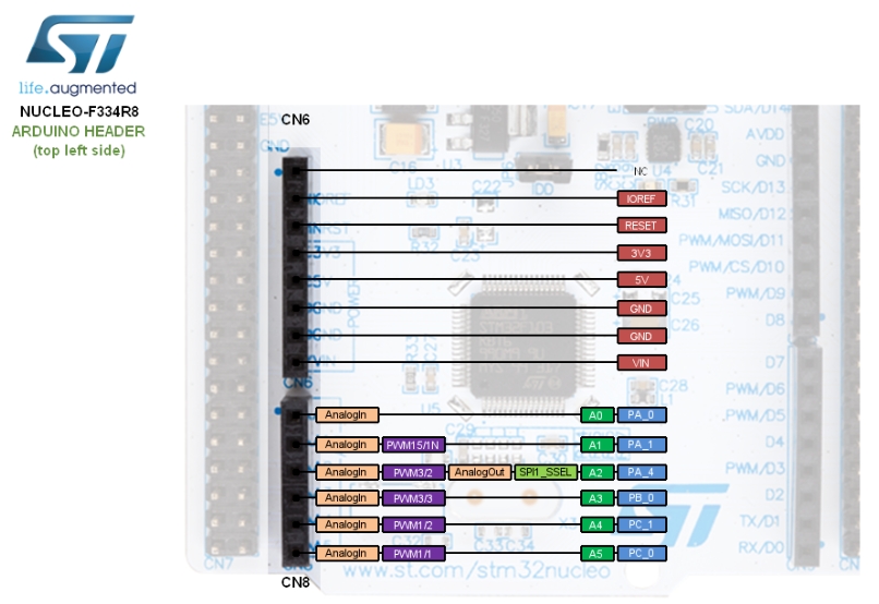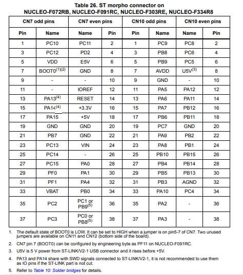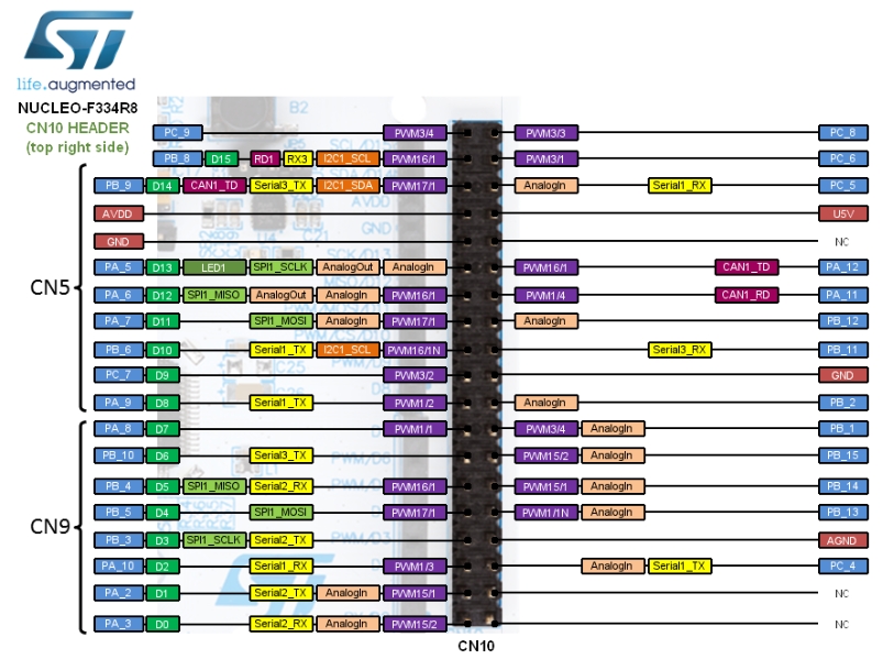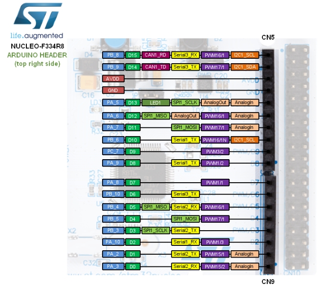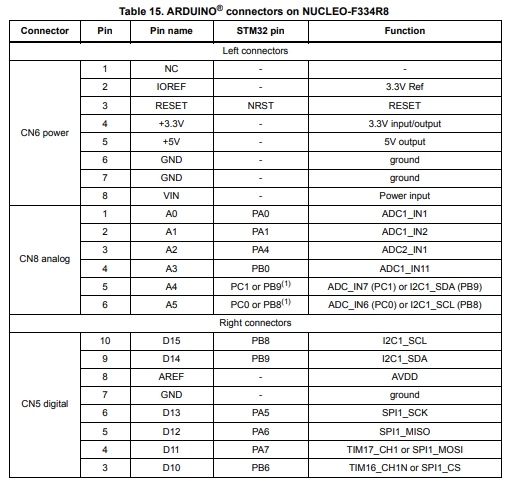 Pour piloter la led intégrée qui est connue comme “D13” sur Arduino, il faut sur la carte STM32334R8, piloter la sortie “PA5”, ou “PA_5” comme illustré dans le tableau de correspondance ci-dessous :