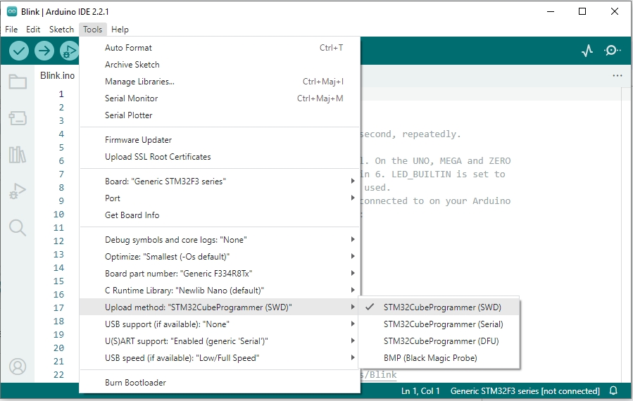 Au 21/01/2024, note de JPD : Il existe peut être une autre méthode pour transférer un programme fait depuis Arduino IDE dans la carte STM32 nucléo, mais à aujourd’hui, je n’ai essayé qu’avec l’upload via STM32CubeProgrammer.
