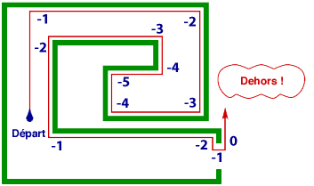 il ne suffit pas de marcher en ligne droite. Il faut compter les changements de direction. Supposons que, comme dans les exemples précédents, tous les angles soient droits. On n’a alors que deux possibilités, tourner à droite ou à gauche selon un angle de 90°. On compte les changements de direction en augmentant d’un point lorsque l’on tourne à gauche et en diminuant d’un point lorsque l’on tourne à droite (y compris la première fois que l’on tourne à droite quand on atteint un mur). Au début, le décompte est à zéro. Les deux instructions sont alors les suivantes : *1 Aller tout droit jusqu’au mur, passer à l’instruction 2 ; *2 Longer le mur par la droite (ou par la gauche, mais toujours dans le même sens) jusqu’à ce que le décompte des changements de direction atteigne zéro, passer à l’instruction 1 ; Il faut répéter ces actions jusqu’à ce que l’on revienne à la lumière du jour.