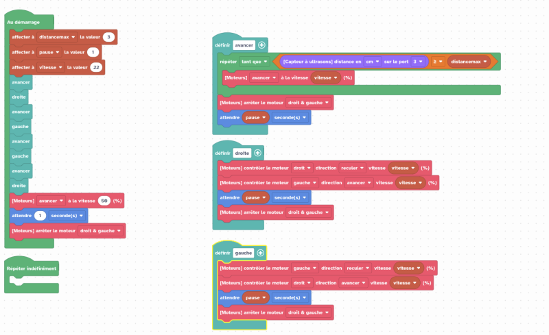 • 2- Création de sous programmes : avancer , reculer, tourner droite 90° , tourner gauche 90°, stop, test distance
